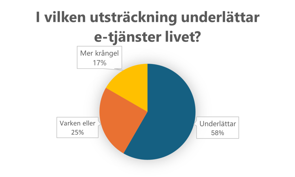 Så sammanfattningsvis, tycker kommunens mer årsrika invånare att digitala tjänster underlättat livet eller inte? Drygt hälften (58 %) tycker att vardagen har blivit enklare med de digitala möjligheterna och resten svarade varken eller, eller att det helt enkelt blivit mer krångligt.